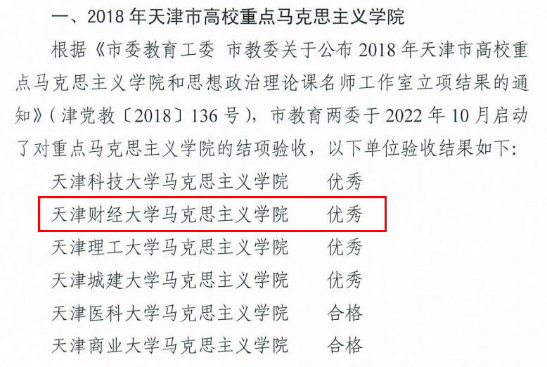 2018年,学院入选天津市高校重点马克思主义学院建设计划,在建设期内,校党委、行政把马克思主义学院建设工作摆在重要位置,将马克思主义学院作为重点学院、马克思主义理论学科作为重点学科、思想政治理论课作为重点课程加强建设,给予优先保障;马克思主义学院按照“一体两翼”的总体发展思路,夯实平台基础,在师资队伍建设、学科建设、课程建设方面持续发力,学院建设取得长足进展,各方面工作迈上新台阶。
