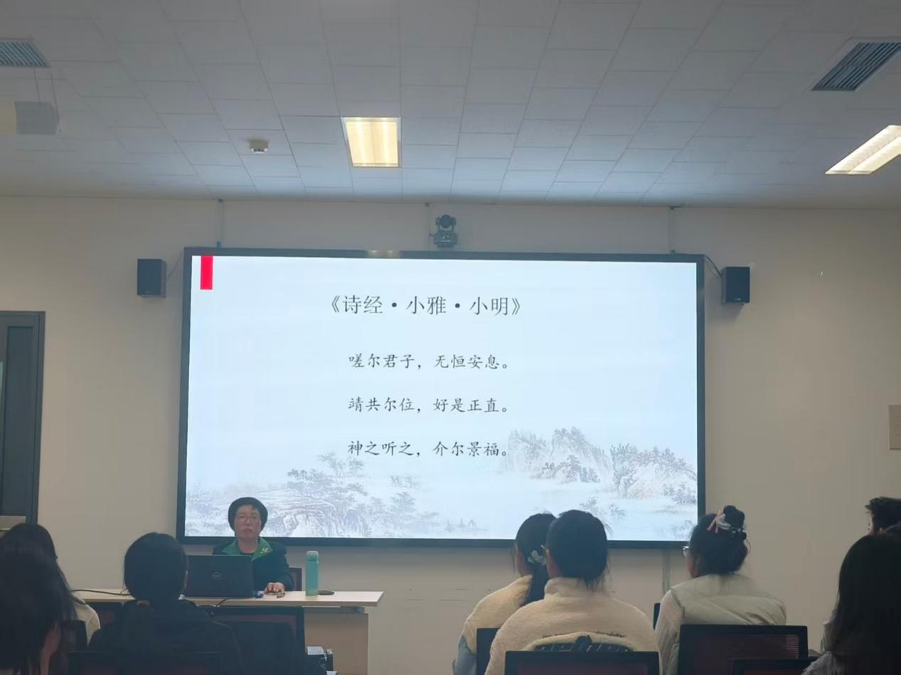 讲座尾声,高红老师带领同学们齐声朗诵《诗经·小雅·小明》。她在总结时强调,中华优秀传统文化是青年成长的“精神沃土”,希望同学们将传统文化中的“担当精神”融入学业科研与未来规划,既做“仰望星空”的理想者,也做“脚踏实地”的实干者,在民族复兴的征程中书写青春答卷。
