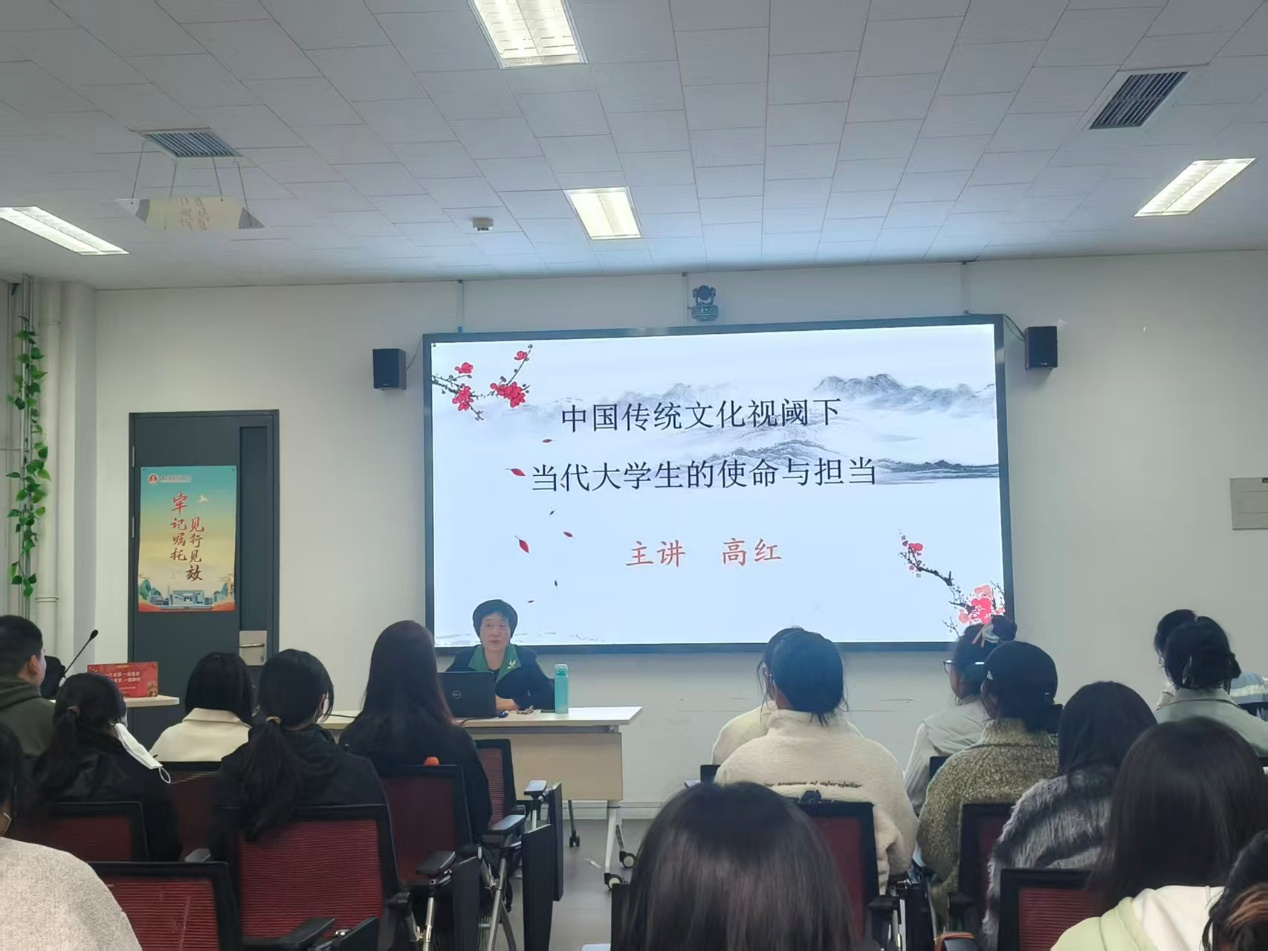 为引导当代大学生从中华优秀传统文化中汲取精神力量,精准锚定新时代青年的责任坐标,近日,我院特邀高红老师作“中国传统文化视域下当代大学生的使命与担当”主题讲座,研一全体新生和研二研三学生代表参加活动。