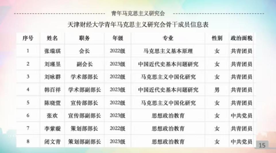 青马会自2017年成立以来,始终坚守“坚持真理、崇尚学术、追求卓越”的初心,致力于打造学院研究生马克思主义理论学习和学术研究的高质量交流平台。会长张瑞琪同学介绍了青马会的基本情况、主要活动和各部门职能,并宣读了新一届青马会骨干成员名单。2021级青马会骨干成员分享了在青马会工作期间的经验与感悟,并表达了对青马会新一届全体成员的期许。2022级和2023级骨干成员分别作了工作规划,展望青马会未来发展。