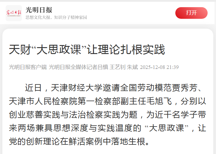近日,天津财经大学邀请全国劳动模范贾秀芳、天津市人民检察院第一检察部副主任毛旭飞,分别以创业慈善实践与法治检察实践为题,为近千名学子带来两场兼具思想深度与实践温度的“大思政课”,让党的创新理论在鲜活案例中落地生根。