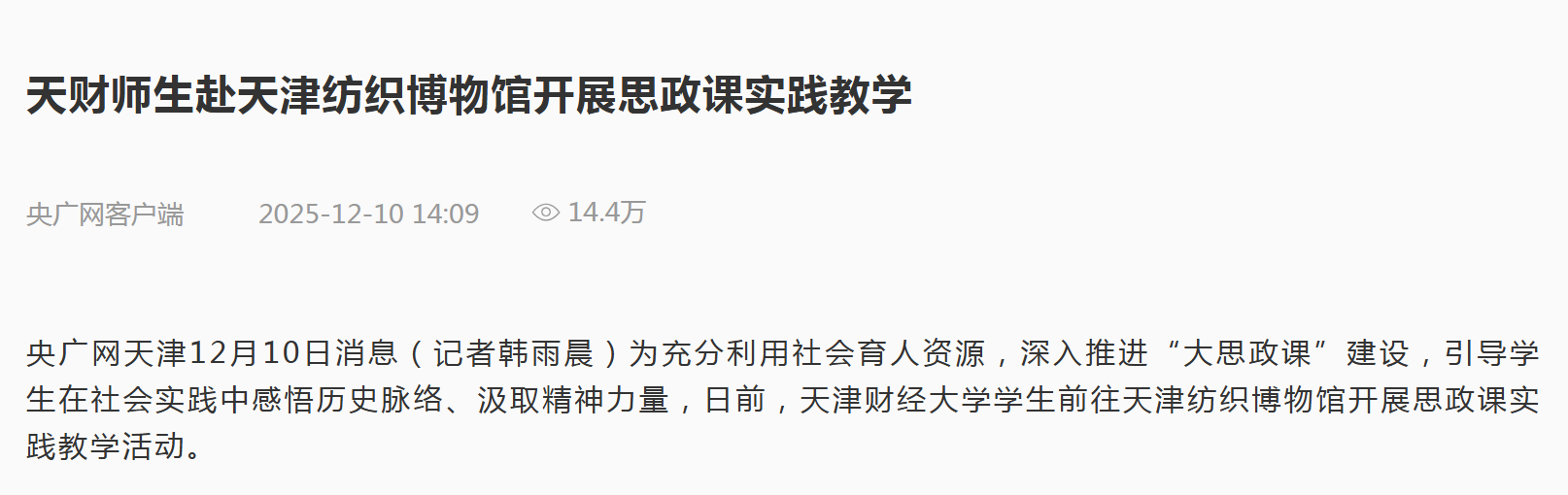 央广网天津12月10日消息(记者韩雨晨)为充分利用社会育人资源,深入推进“大思政课”建设,引导学生在社会实践中感悟历史脉络、汲取精神力量,日前,天津财经大学学生前往天津纺织博物馆开展思政课实践教学活动。